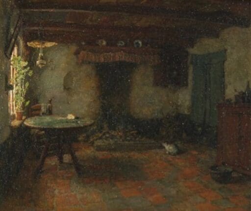 Arthur Briët (Madioen 1867 – Nunspeet 1939) Interieur met vrouw bij haard Olieverf op doek, 31 x 41 cm