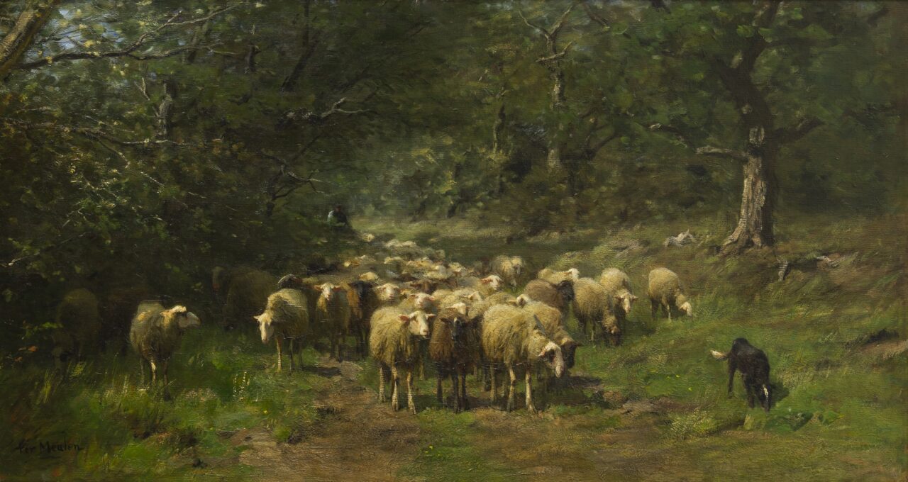 Schaapskudde met herder op bospad, ongedateerd. Olieverf op doek, 56 x 102 cm.